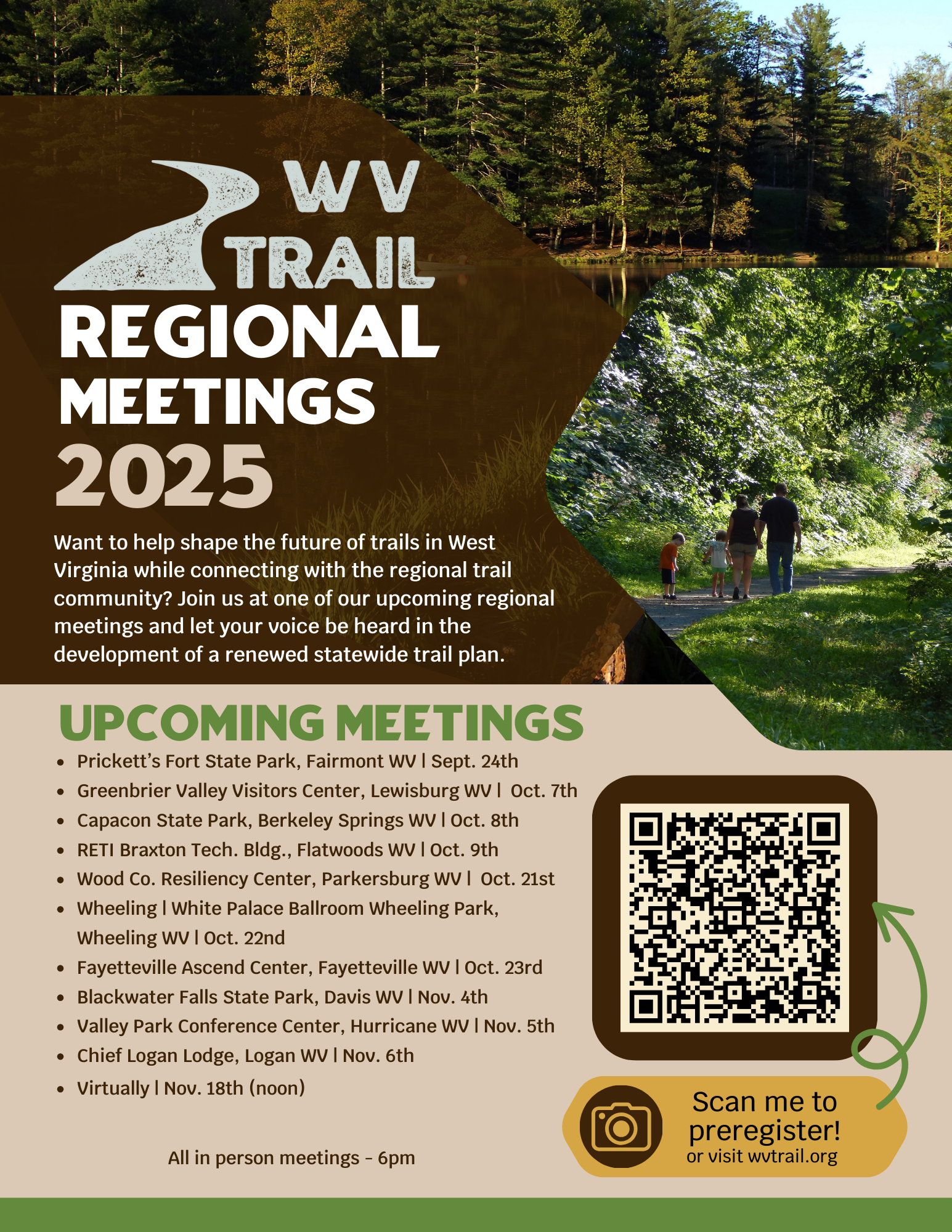Want to help shape the future of trails in West Virginia while connecting with the regional trail community? Join us at one of our upcoming regional meetings and let your voice be heard in the development of a renewed statewide trail plan.